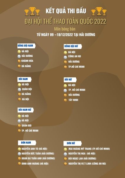 Đại hội Thể thao toàn quốc 2022 khép lại sáng nay 18/12 với Huy chương vàng đơn nữ thuộc về Vận động viên Mai Hoàng Mỹ Trang - TP.HCM và Đơn nam là Vận động viên Nguyễn Anh Tú - Hà Nội.